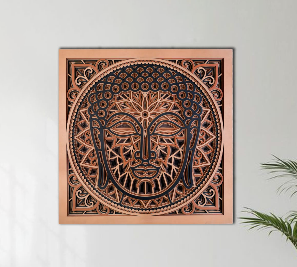 Model No: LWA260448 Size: 24" x 24" Layers: 10 Description: The Buddha's face layer art is made from wooden carvings,The carving is intricate and detailed,the Buddha's face expressing a calm and peaceful expression.The eyes, nose, and mouth of Buddha are all rendered in realistically.The carving is made from a dark wood, which gives it a rich and luxurious appeal.The layer art's carving gives the overall effect of harmony, tranquility, and enlightenment.